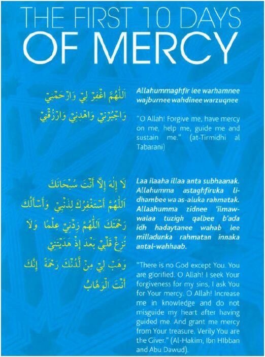 These first 10 nights are the nights of Mercy. Allah is ever merciful that He specifically gave 10 nights especially to supplicate to him asking him for His infinite mercy. Allahu Akhbar!